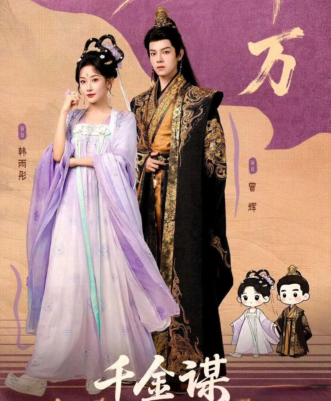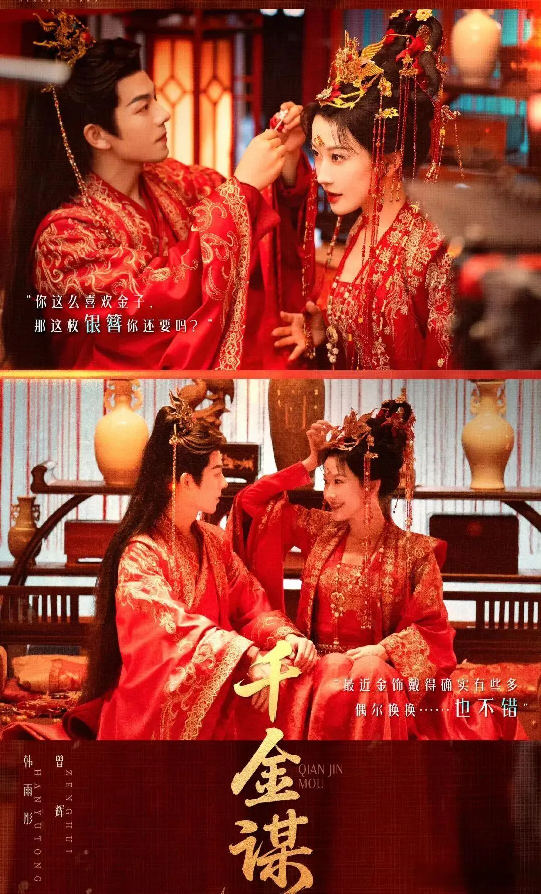 但《千金谋》偏反其道而行之,制作周期比普通短剧多两倍,高清镜头下的服化道精致得不输长剧——女主的商人造型干练飒爽,帝后大婚的金绣礼服更是惊艳;全剧采用原声台词,韩雨彤的娇俏财迷腔和曾辉的委屈帝王音适配度拉满,光听声音就有代入感。