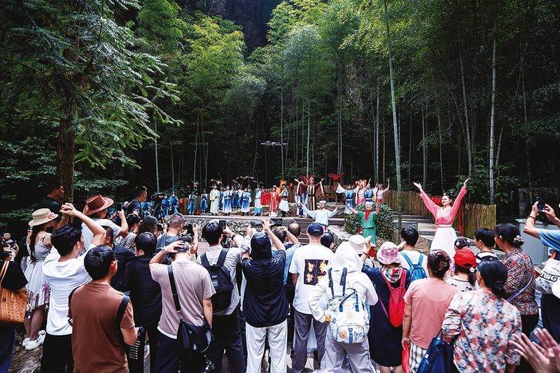 “ 快帮我们拍张照!”“九华天池的水真像一面镜子!”“十一”假日期间,九华天池景区的湖边栈桥上,游客们争相打卡秋日美景,欢声笑语不断;夜幕降临,山下的傩仙镇景区热闹依旧,大型实景剧《傩王传奇》精彩上演,戴彩绘傩面具的演员刚登场,台下便掌声雷动;国庆期间新增的“光影傩韵”烟花秀在古建筑群上空绽放时,游客们纷纷举起手机记录,在夜色中感受非遗的独特魅力。在石台牯牛降景区,大型“行浸式”实景舞剧《天降仙缘》迎来首演,“首演就吸引了超过3000名游客”,牯牛降景区演艺项目负责人杜轩如是说。